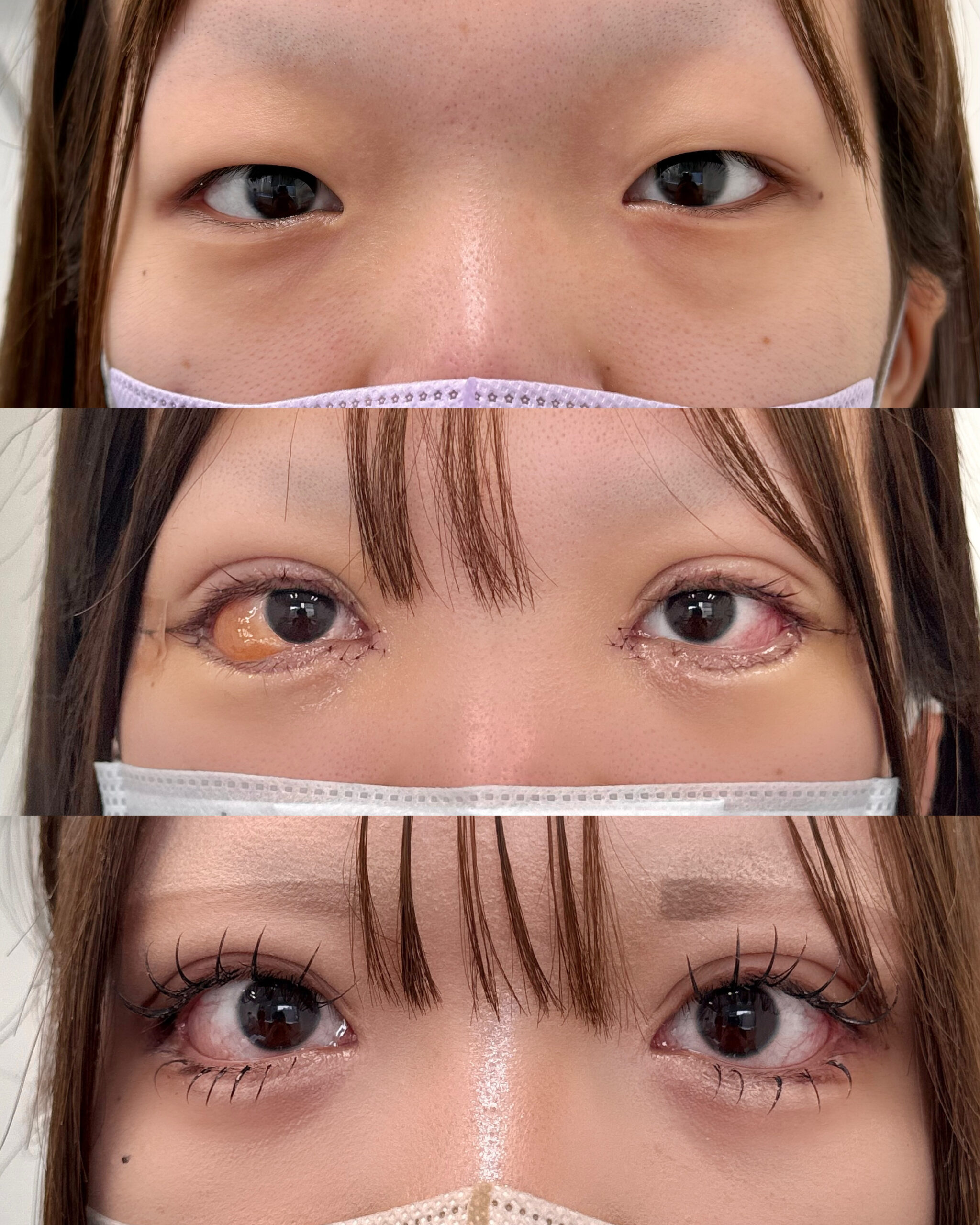 この方はなるべく大きく印象を変えるために、目周りのドールアイフルセット【二重埋没法+目頭切開+たれ目形成+目尻切開】を行い、まつ毛のキワを見えるように+睫毛上皮膚切除も行っております。