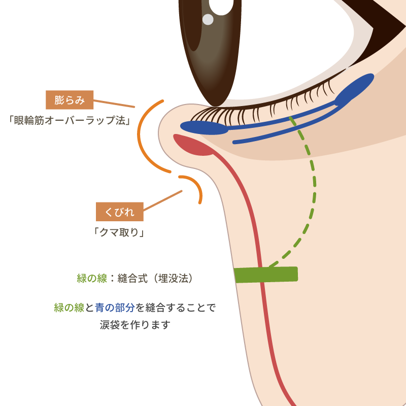 縫合法は、目の裏側(結膜側)から医療用の糸を使用し、涙袋の靭帯にあたる「くびれ」を強くします。