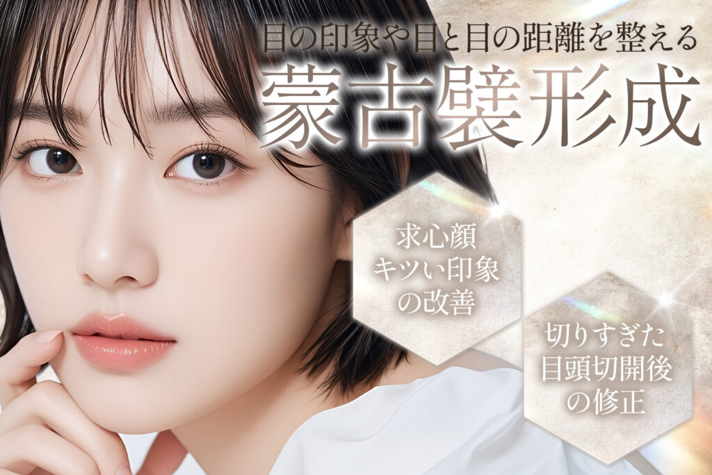 目頭切開により蒙古襞を切除した方や、生まれつき蒙古襞がほとんどない方の中には、目と目の距離が近づきすぎて見えたり、目元が強く・きつい印象になってしまうことがあります。