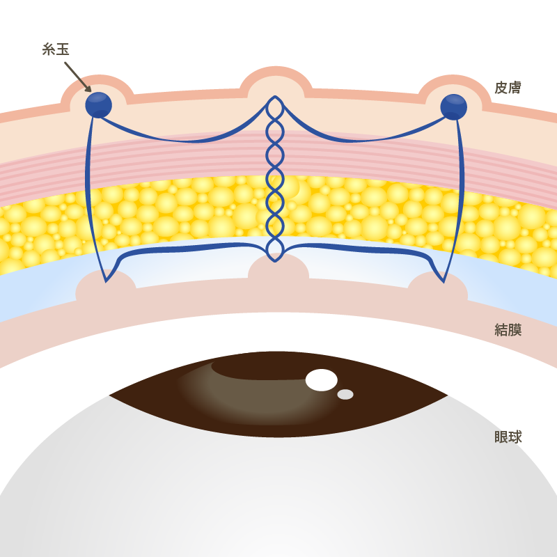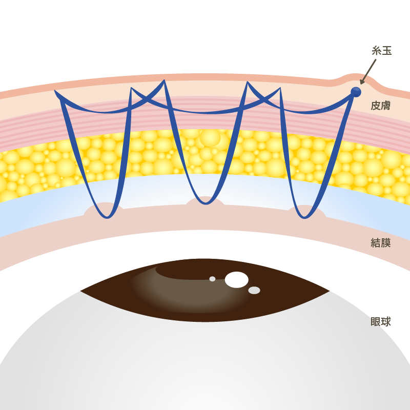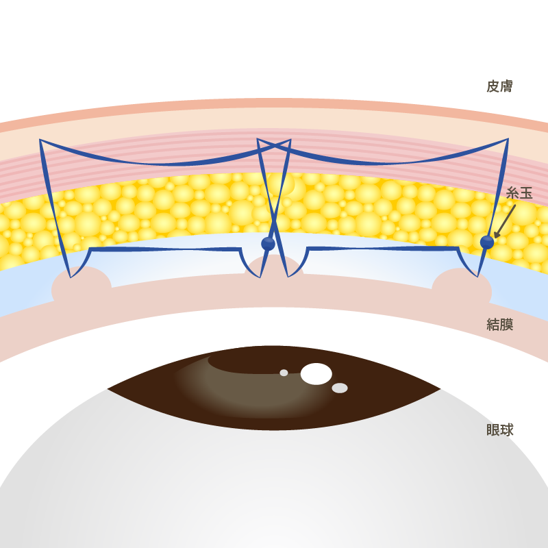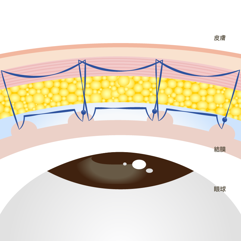 3か所以上でしっかり支えることで、二重のラインを目尻まで食い込ませ、持続も長くキープできる方法です。アナザーループ・ダブルよりも更に持続力を重視した術式。挙筋法となります。