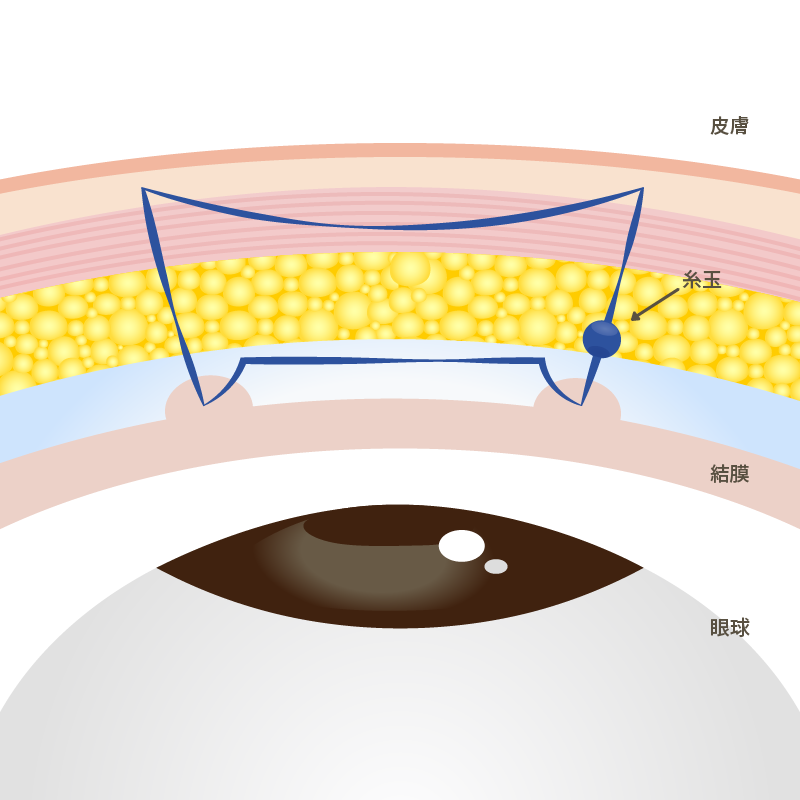 瞼の表⾯に針を通すことがないので、表⾯に傷が出来ず腫れにくいです。直後からお化粧可能で傷や⽷のボコ付きが少なく、術直後からメイクが可能な⼆重術です。