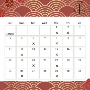 2026年1月の営業予定日になります。 (営業日は告知なく変更となる可能性がございます。)